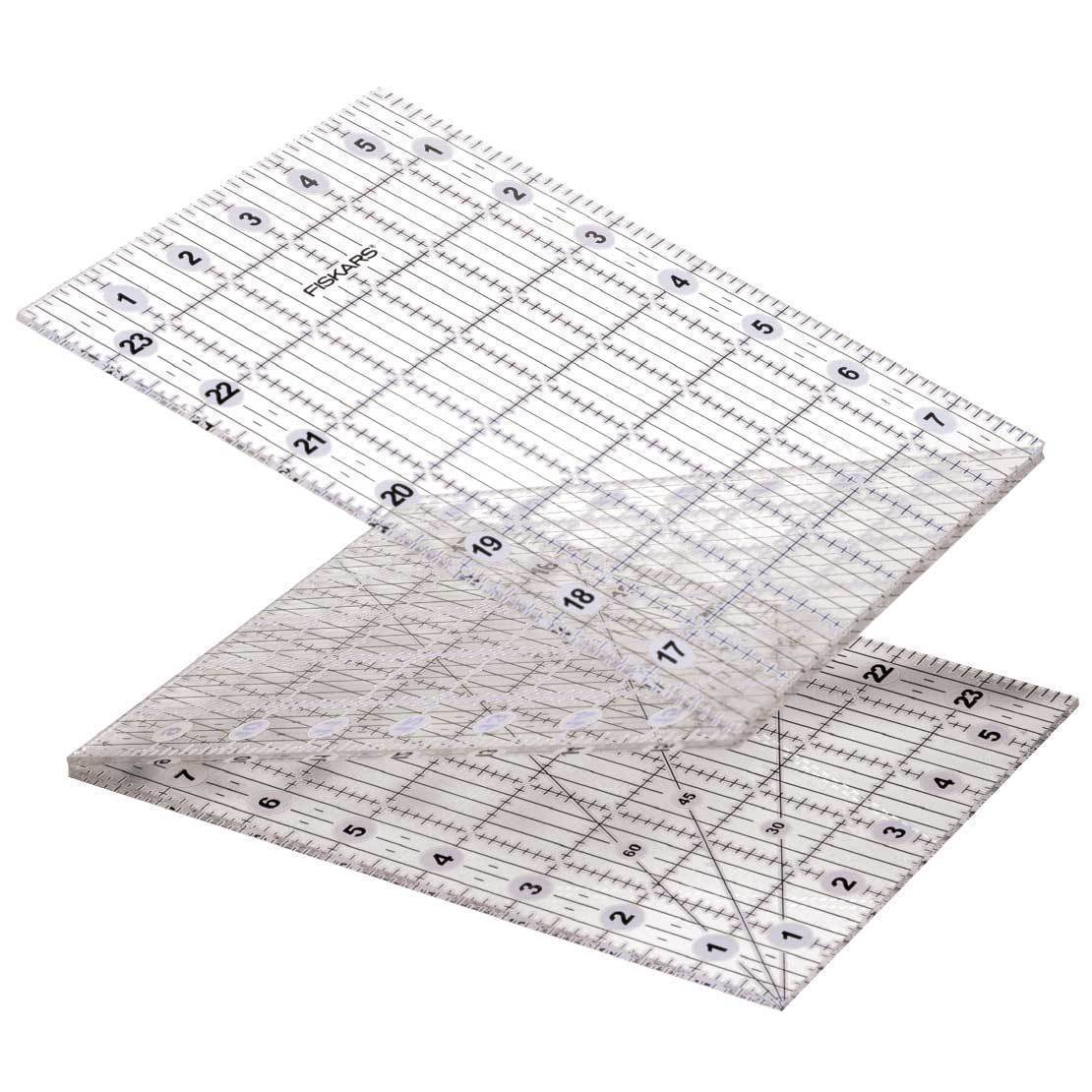 Save space at home and take your ruler on the road with this smart folding design. A 6" x 24" ruler folds to a third of its size for a portable measuring tool that allows you to make long cuts without the bulk of a regular ruler. A sturdy, convenient design makes it easy to cut fabric strips right from the bolt, while the ruler’s folded 6" x 8" position is great for smaller cuts and storage. Clear, durable hinges allow the ruler to lie perfectly flat for smooth cuts without catching or snagging. Lines feature clear intersections and two tones for improved visibility on light, dark and patterned fabrics. Plus, 30-, 45- and 60-degree angle lines simplify angle cutting. Features Ideal for cutting fabric strips up to 6" wide and squares directly from the bolt 6" x 24" ruler folds to 6" x 8" to make storage and travelling a breeze Clear intersections and two-tone markings improve visibility on light, dark and patterned fabrics 30-, 45- and 60-degree angle lines make it easy cut precise angles Made of 3 mm-thick, premium-quality, clear acrylic for lasting durability Lifetime warranty